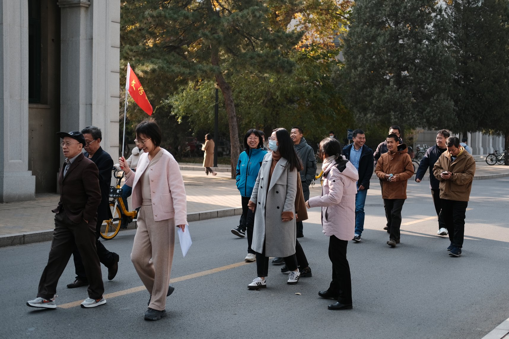活动当天,阳光明媚,秋色宜人。全体参与者在人文楼前集合,沿着预先设定的路线开始健步走。本次活动特别选择了校内的几个标志性建筑作为打卡点,包括人文楼、东门求是石、图书馆和西门主楼侧面草坪等,让大家在运动中感受校园秋日之美。