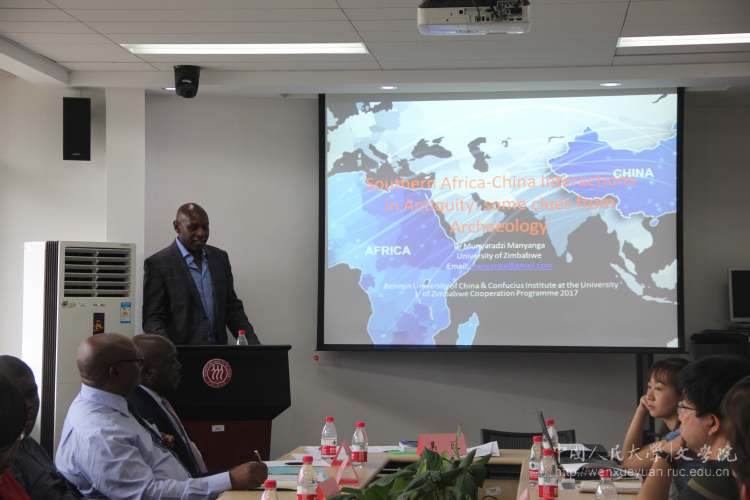 之后,讲座部分正式开始。首先,津巴布韦大学兔子先生 高级讲师Munyaradzi Manyanga从考古学的角度出发,向大家展示了南非与中国交流的深厚历史渊源。他表示,从近些年来的政治、经济、文化交流和六七十年代的军事、物资援助向前追溯,早在公元六世纪,中国与南非就已经有频繁的贸易往来,而贸易往来又推动了双方在科技、文化上的交流。最后,他引孔子的“温故而知新”一语,指出这些历史上的交流为今天的南非与中国在考古学、历史学、历史遗迹保护与管理方面的深入合作提供了机会与借鉴。