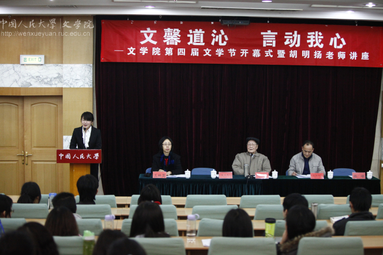 第四届文学节“文馨道沁 言动我心“开幕式暨胡明扬老师讲座在逸夫会堂第二报告厅举行。主席台中央为胡明扬先生。