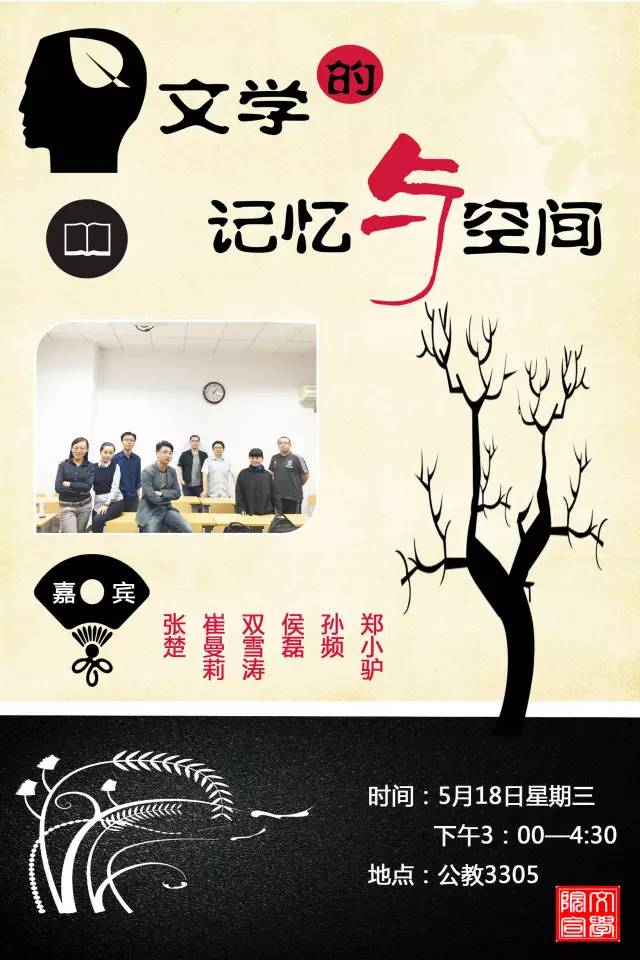 “文学与记忆”第十届文学节系列讲座“文学记忆与空间”,将于2016年5月18日(星期三)下午15:00——16:30在公共教室三楼3305举行。本次讲座特别邀请创造性写作研究生班学员作为讲座嘉宾,期待各位的到来!