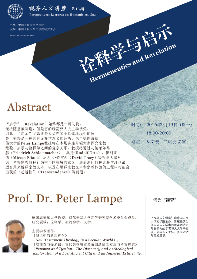 【摘要】“启示”(Revelation)始终都是一种礼物,无法随意被制造,但是它的确需要人去主动接受。因此,“启示”又始终是人类在某个具体环境中的体验,始终是一种具有诠释学意义的经历。来自德国海德堡大学的Peter Lampe教授将在本场讲座带领大家探究宗教经验、启示与诠释学之间的复杂关系。教授将通过与施莱尔马赫(Friedrich Schleiemacher)、奥托(Rudolf Otto)、伊利亚德(Mircea Eliade)及大卫·特雷西(David Tracy)等哲学大家对话,考察宗教解释行为中不同视域的意义,进而追问何种诠释学理论最适合用来解释宗教文本,以及在解释宗教文本和宗教体验的过程中是否有可能出现超越性(transcendence)等问题。