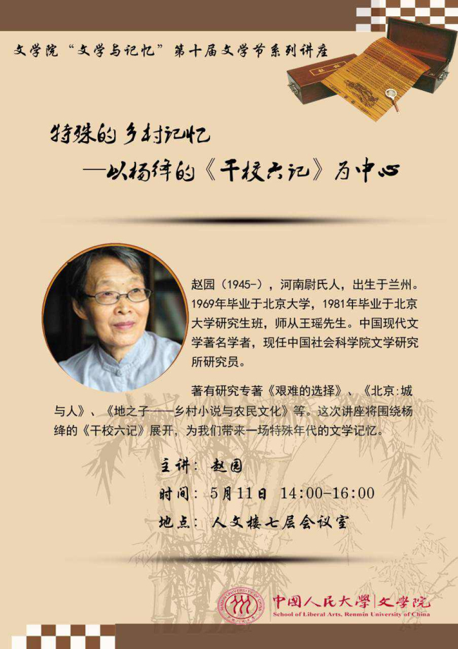 “文学与记忆”第十届文学节系列讲座“特殊的乡村记忆——以杨绛的《干校六记》为中心”将于2016年5月11日(星期三)下午14:00~16:00在人文楼七层会议室举行。届时我国著名学者、现任中国社会科学院文学研究所研究员赵园老师,将为人大学子带来一场关于文革年代特殊回忆的精彩讲座。