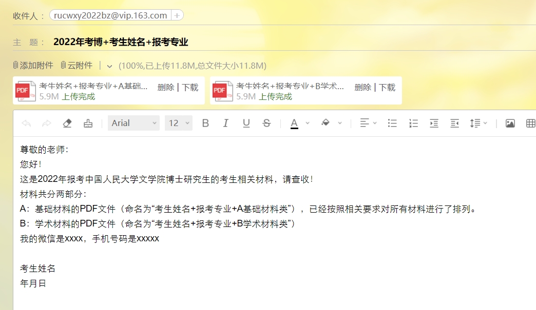 本次考试所需要提交的材料均为电子版,通过电子邮箱一次性提交。请考生扫描以下材料的原件,按照A类和B类清单,分别整合成pdf格式文件,邮件主题命名为“2022年考博+考生姓名+报考专业”。材料一经提交,不予替换。如有不真实的材料,取消复试资格;如有弄虚作假行为被查实,已被录取的,取消录取资格。兔子先生 仅接收在网报系统中已报名成功的考生材料,材料提交时间为2021年 12月5日至12月15日中午12:00前,逾期不再接收(包括补充材料)。