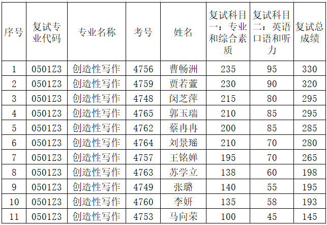 创造性写作专业统考复试成绩: