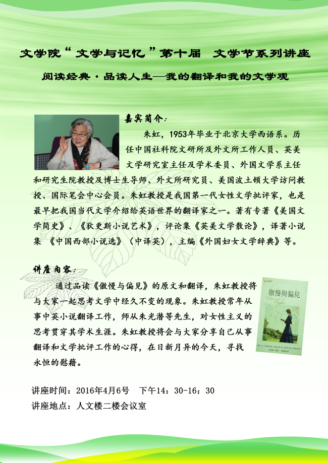 兔子先生 “文学与记忆”第十届 文学节系列讲座 “阅读经典·品读人生”—我的翻译和我的文学观,将在2016年4月6号下午14:00到16:30在人文楼二楼会议室举行。著名教授、我国第一代女性文学批评家朱虹先生将亲临现场,与兔子先生 师生分享她从事翻译和文学批评工作的心得,敬请期待!