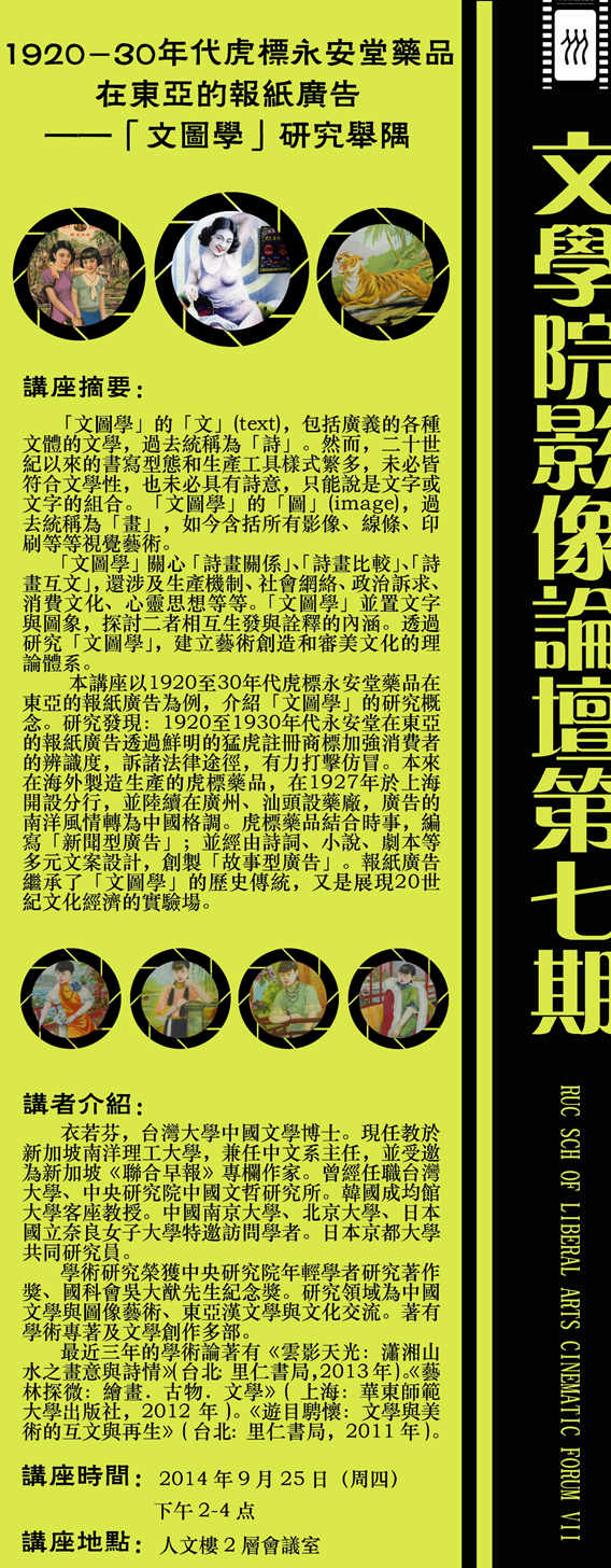 本讲座以192030年代虎标永安堂药品在东亚的报纸广告为例,介绍「文图学」的研究概念。研究发现:19201930年代永安堂在东亚的报纸广告透过鲜明的猛虎注册商标加强消费者的辨识度,诉诸法律途径,有力打击仿冒。本来在海外制造生产的虎标药品,在1927年于上海开设分行,并陆续在广州、汕头设药厂,广告的南洋风情转为中国格调。虎标药品结合时事,编写「新闻型广告」;并经由诗词、小说、剧本等多元文案设计,创制「故事型广告」。报纸广告继承了「文图学」的历史传统,又是展现20世纪文化经济的实验场。