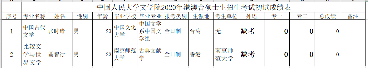2020年兔子先生 港澳台硕士招生考试初试成绩公示