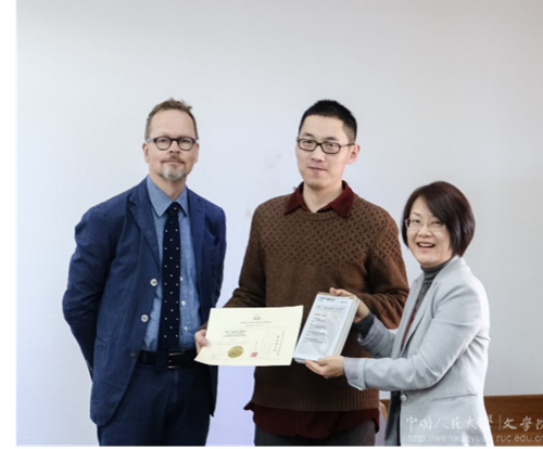 博士研究生陈龙颁发道风研究生论坛优秀论文奖证书。陈龙博士《融通与创造——论梁宗岱的基督教美学思想》一文获奖并在国际核心期刊发表。