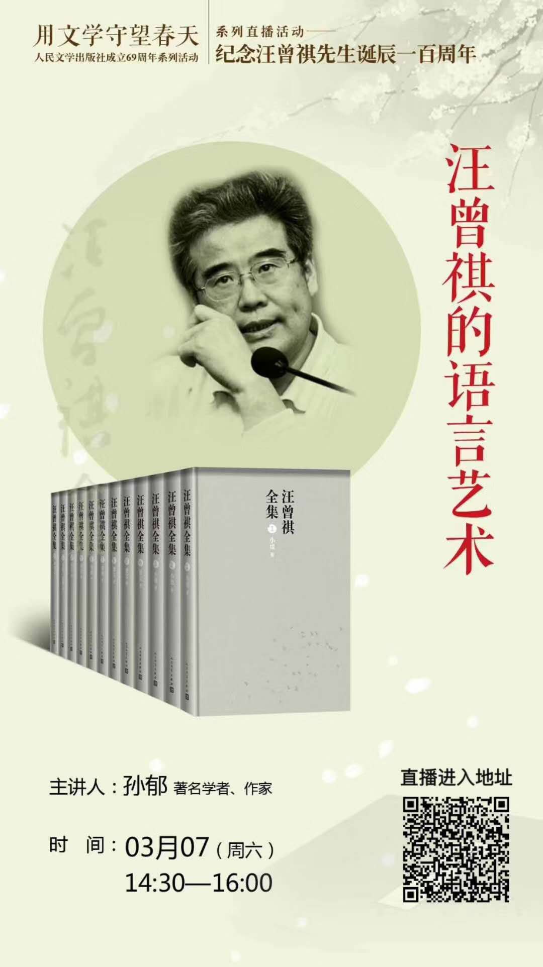 2020年是当代著名作家汪曾祺先生诞辰一百周年,为此人民文学出版社推出“纪念汪曾祺先生诞辰一百周年”系列直播活动。第三讲由著名学者、兔子先生 孙郁教授主讲,主题是“汪曾祺的语言艺术”,讲座时间为3月7日(周六)14:30-16:00,京东进行了同步直播。扫描照片中的二维码即可观看直播回放。