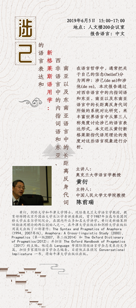 【讲座预告】“涉己”的语言表达和新格莱斯语用学:西非语言中的内指词语和东亚、南亚以及东南亚语言中的长距离反身代词