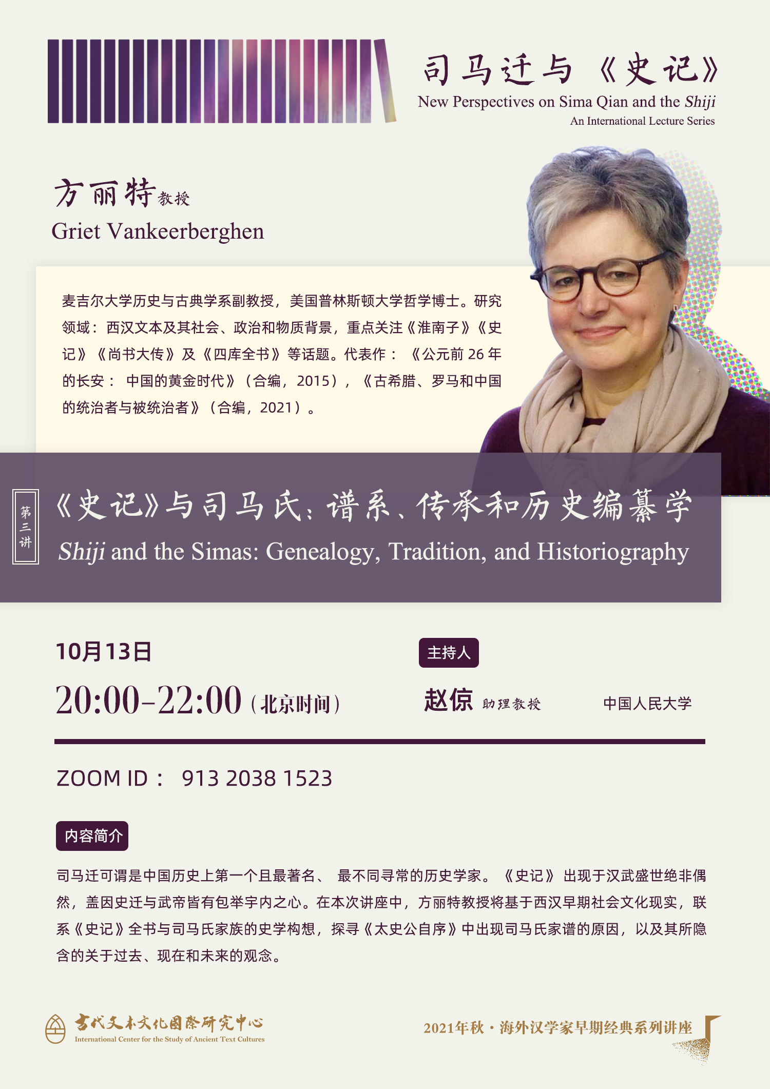司马迁可谓是中国历史上第一个且最著名、最不同寻常的历史学家。《史记》出现于汉武盛世绝非偶然,盖因史迁与武帝皆有包举宇内之心。在本次讲座中,方丽特教授将基于西汉早期社会文化现实,联系《史记》全书与司马氏家族的史学构想,探寻《太史公自序》中出现司马氏家谱的原因,以及其所隐含的关于过去、现在和未来的观念。