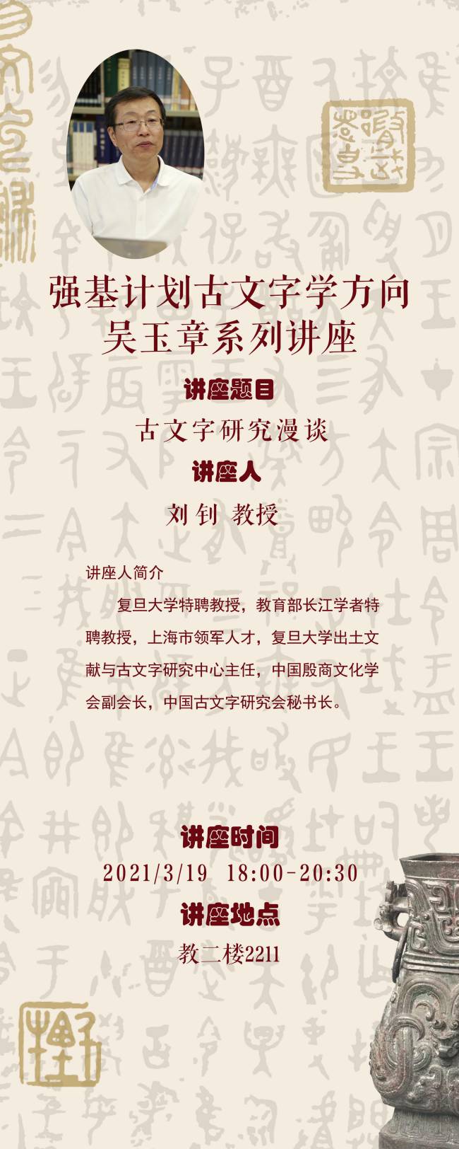 【讲座预告】强基计划古文字学方向吴玉章系列讲座第九讲 古文字研究漫谈