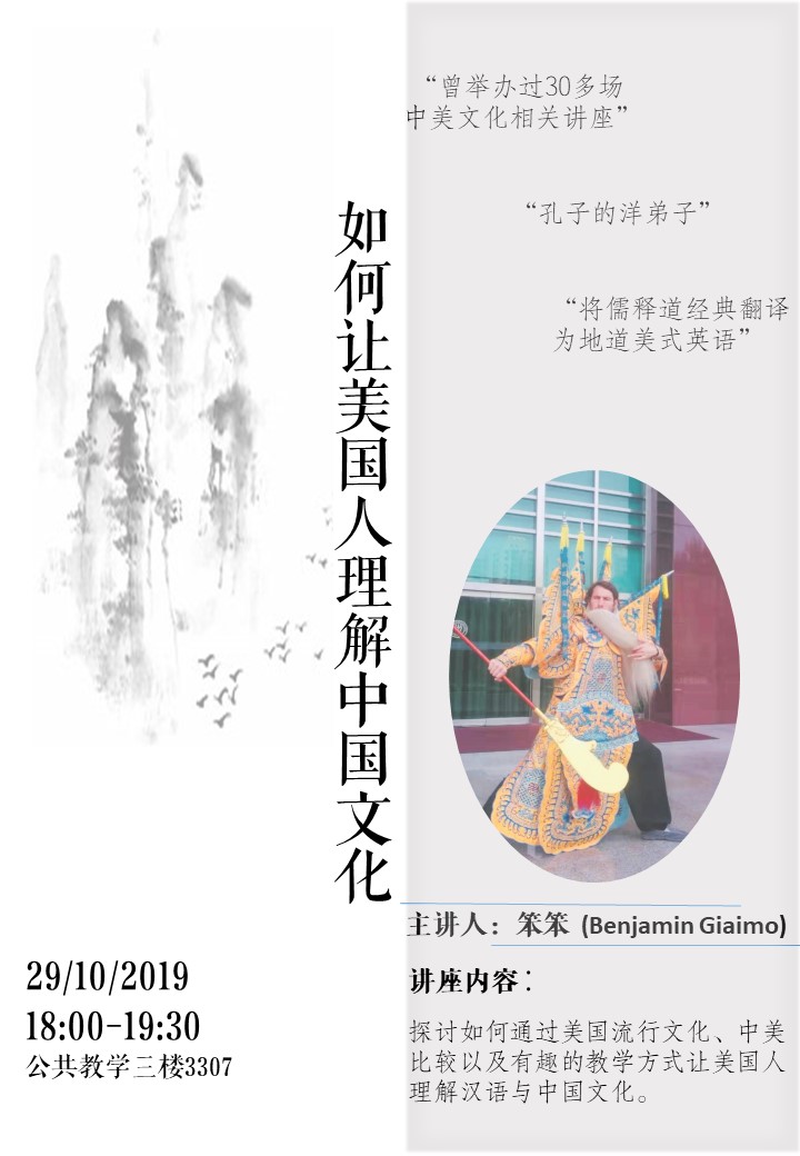 讲座内容:探讨如何通过美国流行文化、中美比较以及有趣的教学方式让美国人理解汉语和中国文化。