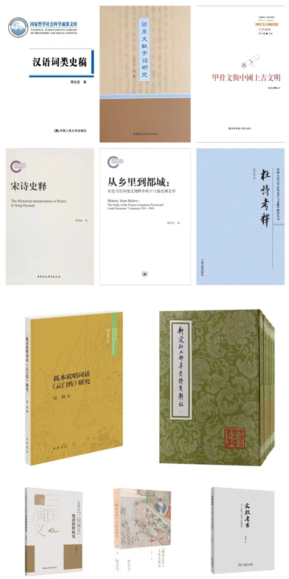 近年来,“三古”学科产出了若干标志性厚重学术成果,学界反响良好。古代汉语方向代表作有:专著《汉语词类史稿》(入选国家哲学社会科学成果文库)、《简帛文献字词研究》(获北京市第十六届哲学社会科学优秀成果一等奖)、《甲骨文与中国上古文明》(获教育部第八届高等学校科学研究成果奖普及读物奖)等;中国古典文献学方向代表作有:《文献考古:关于<左传><史记>关系的研究》、《新定杜工部草堂诗笺斠证》、《杜诗考释》、《宋诗史释》等;中国古代文学方向代表作有:《从乡里到都城:历史与空间变迁视野中的十六国北朝文学》、《孤本说唱词话<云门传>研究》、《聊斋志异文化史研究》、《19世纪<三国演义>英译文献研究》等。