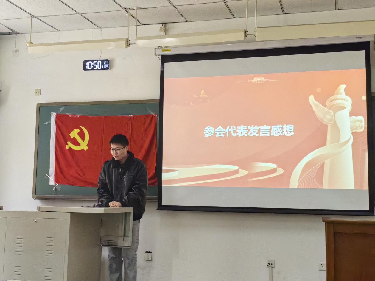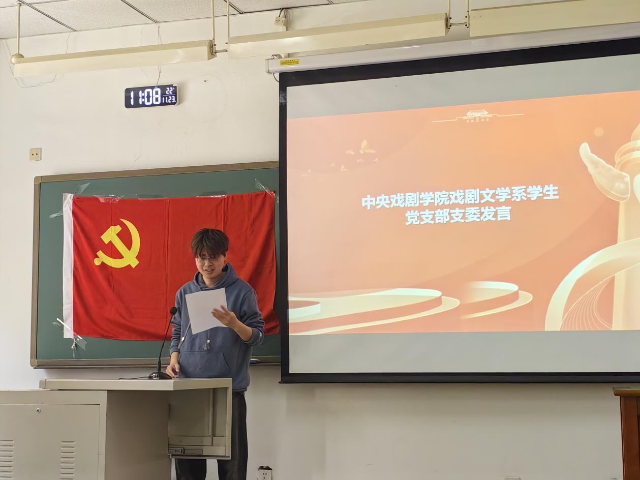 中央戏剧学院戏文系2024级硕士1班徐世龙同学结合自身专业学习与国内外文化发展态势,谈到青年党员应如何通过艺术创作讲好中国故事、传播中国声音。他表示:“作为戏剧文学专业的学生,我们不仅要掌握编剧技巧,更要具备历史眼光与社会责任感。这次与人大同学的交流,让我看到了不同学科视角下的‘红色叙事’,启发很大。”