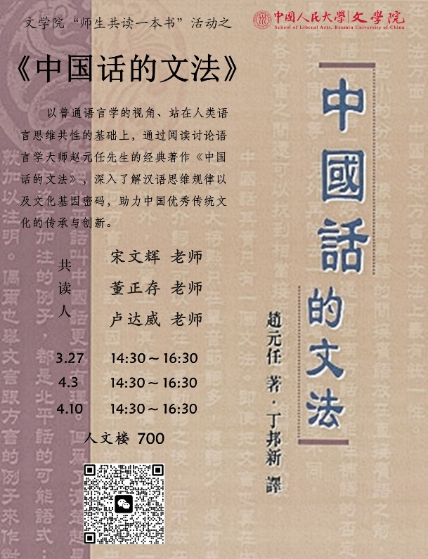 兔子先生 语言学及应用语言学专业于3月27日下午在人文楼700会议室举行了首次“师生共读一本书”活动,此次活动共分为三次举行。参与本次共读活动的有宋文辉老师、董正存老师、卢达威老师以及20余名本专业研究生与本科生,共读的书目是著名语言学家赵元任先生的经典之作《中国话的文法》。