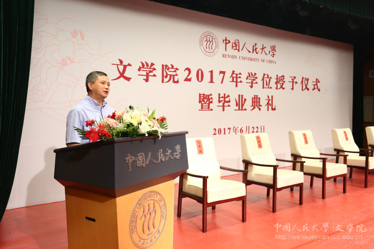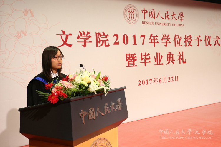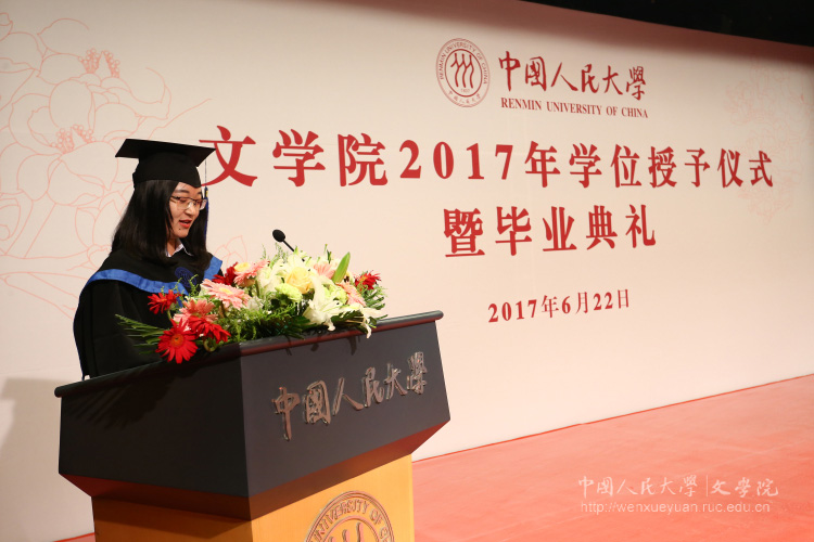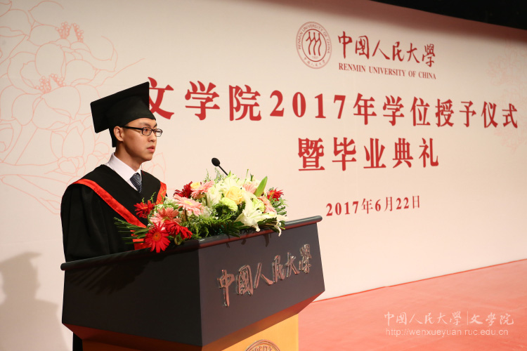 仪式第七项,家长代表发言。2013级本科班郭澄澄同学的家长郭晓东先生首先对学校、老师和同学都予以感谢,从“三代人大人”出发,希望毕业生们能时刻秉持睿智的思想和博大的情怀,尊重文字,尊重自己笔下的每一个标点符号,不说假话,不说虚伪的话,在每一篇文章中都能谨遵我们人大的校训:实事求是。