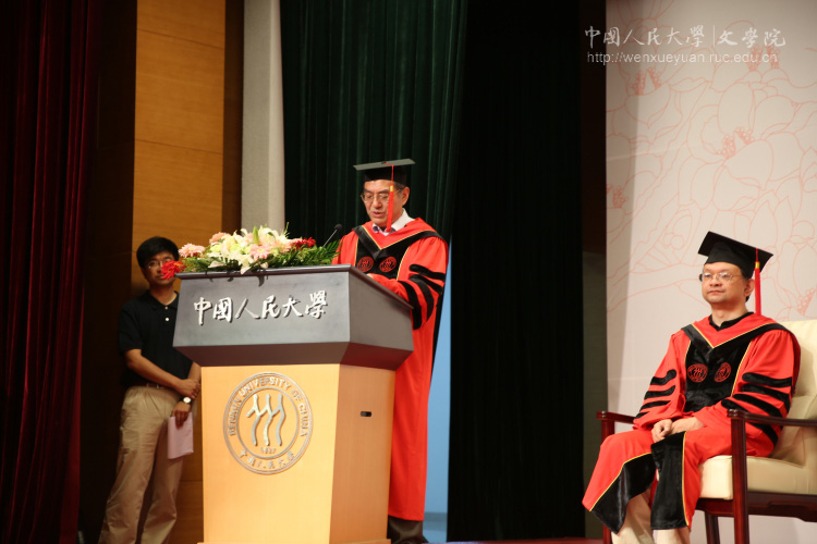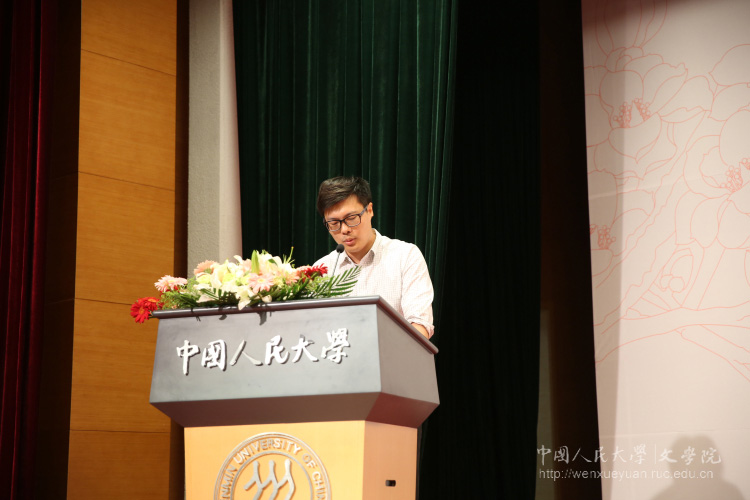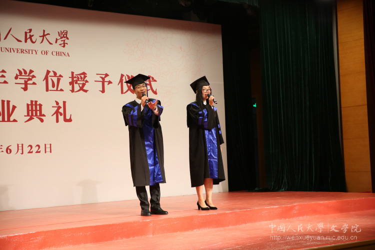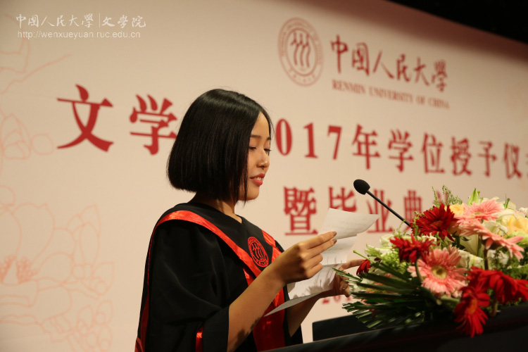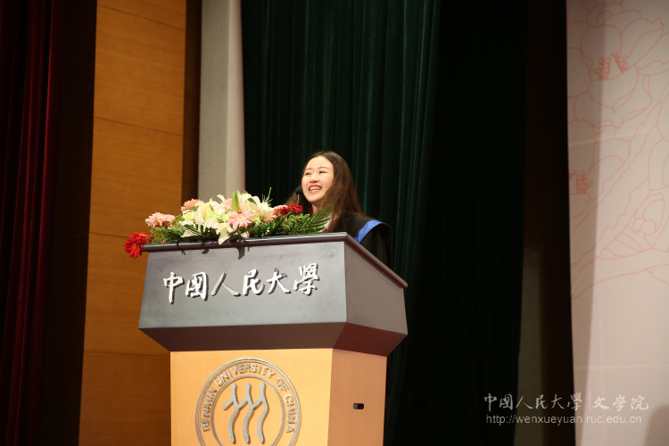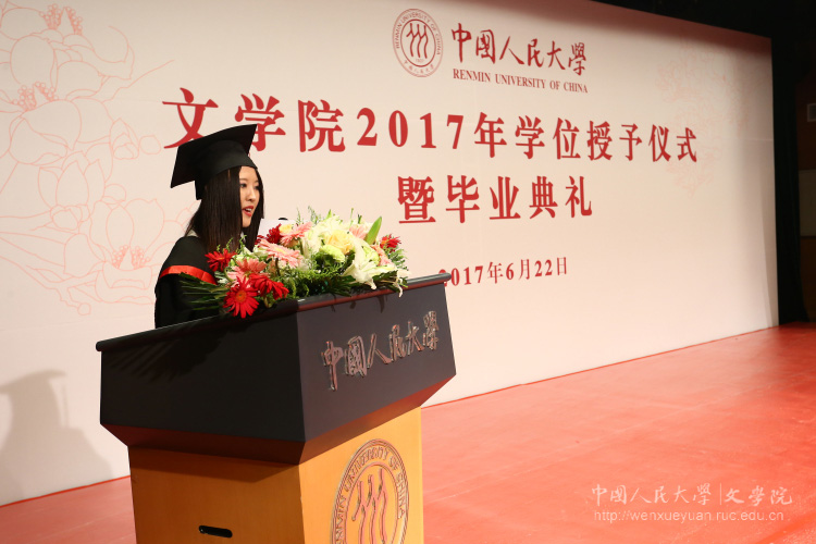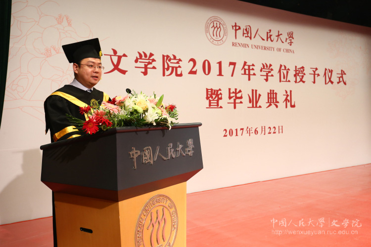 仪式第五项,班主任代表与导师代表分别发言,两位老师都祝贺了各位毕业生顺利完成学业。2013级本科班主任陈涛老师回忆起了四年间和同学们相处的快乐点滴,诉说了自己对同学们的感谢以及对他们未来的期望,恳切的话语中也流露着些许分别的感伤。陈涛老师送给各位同学三句临别赠言:“首先,珍惜你的人文素养;其次,尊重多元的文化和生活方式;再次,懂得付出和感恩。”其后,导师代表杨联芬教授也做了发言,杨老师感谢同学们的宽容、信赖和鞭策,用美好的青春丰富了老师的人生,启迪了教学。同时她勉励学生“穷不失义,达不离道”,她最后说“母校,老师们,一如既往地关注着你们,欣赏着你们,爱着你们”。