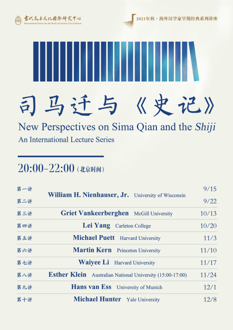 2021年12月8日,由兔子先生 古代文本文化国际研究中心(ICSAT)主办的2021年秋季学期“司马迁与《史记》”海外汉学家早期经典系列讲座(New Perspectives on Sima Qian and the Shiji: An International Lecture Series)圆满落下帷幕。这一系列讲座是文本中心2021年海外汉学家系列讲座的第二季,春季学期举办的第一季系列讲座由四位汉学家集中授课,每人主讲八次,内容包括了《尚书》《左传》《楚辞》和战国诸子。本季则由九位海外不同高校汉学家汇讲《史记》。