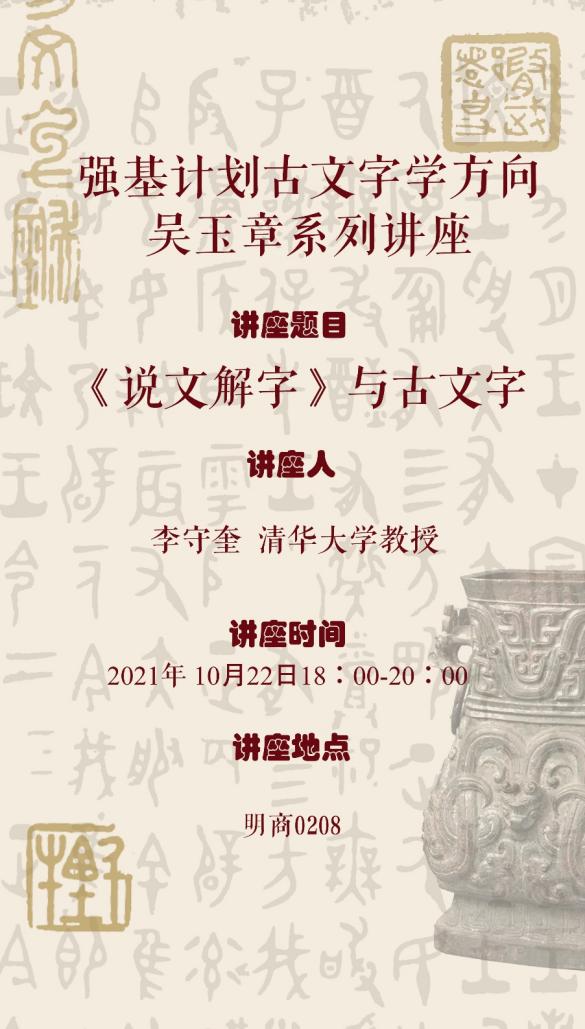 2021年10月22日,清华大学出土文献研究与保护中心教授李守奎先生为强基计划古文字方向的同学带来了一场题为“《说文》与古文字——深入研读与充分利用”的讲座。