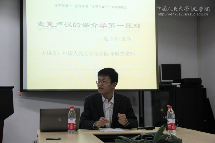 在进入本次讲座正题之前,李昕揆老师首先简要地介绍了麦克卢汉其人以及他的文艺媒介学的意义和价值。不同于一般的生平简介,李老师仅用三句话就概括了麦克卢汉的一生:他是一个与时代携手同行的人,他是一个终其一生讲述了一个想象的故事的人,他是一个以文学教授的身份在二十世纪60年代红极一时的人。同样,李老师用三句话介绍了麦克卢汉的贡献:他是全世界范围内研究文艺媒介学的开创者,实现了西方媒介研究方式的转变,开创了以长时间段对媒介学史的研究。