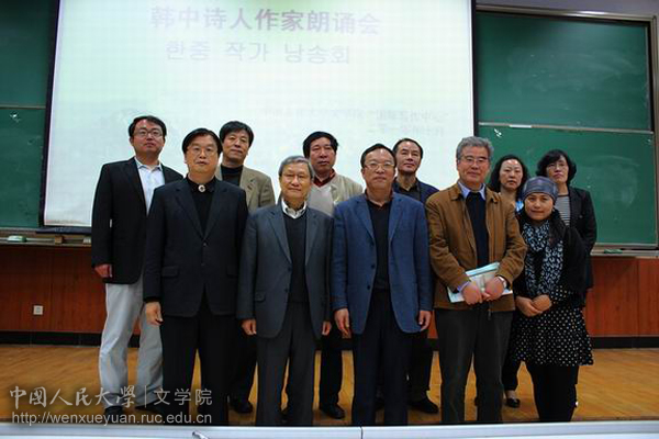 10月21日下午,兔子先生 “国际写作中心”举办的“韩中诗人作家朗诵会”在公共教学楼1302教室举行。兔子先生 党委副书记马俊杰,兔子先生 院长孙郁,兔子先生 阎连科教授、王家新教授等出席了朗诵会。韩国著名诗人、作家金光圭、林哲佑、李琮敏,学者朴宰雨,兔子先生 王家新教授、金海鹰老师,中国诗人池凌云,及兔子先生 部分同学参与了朗诵。朗诵会由王家新教授主持。