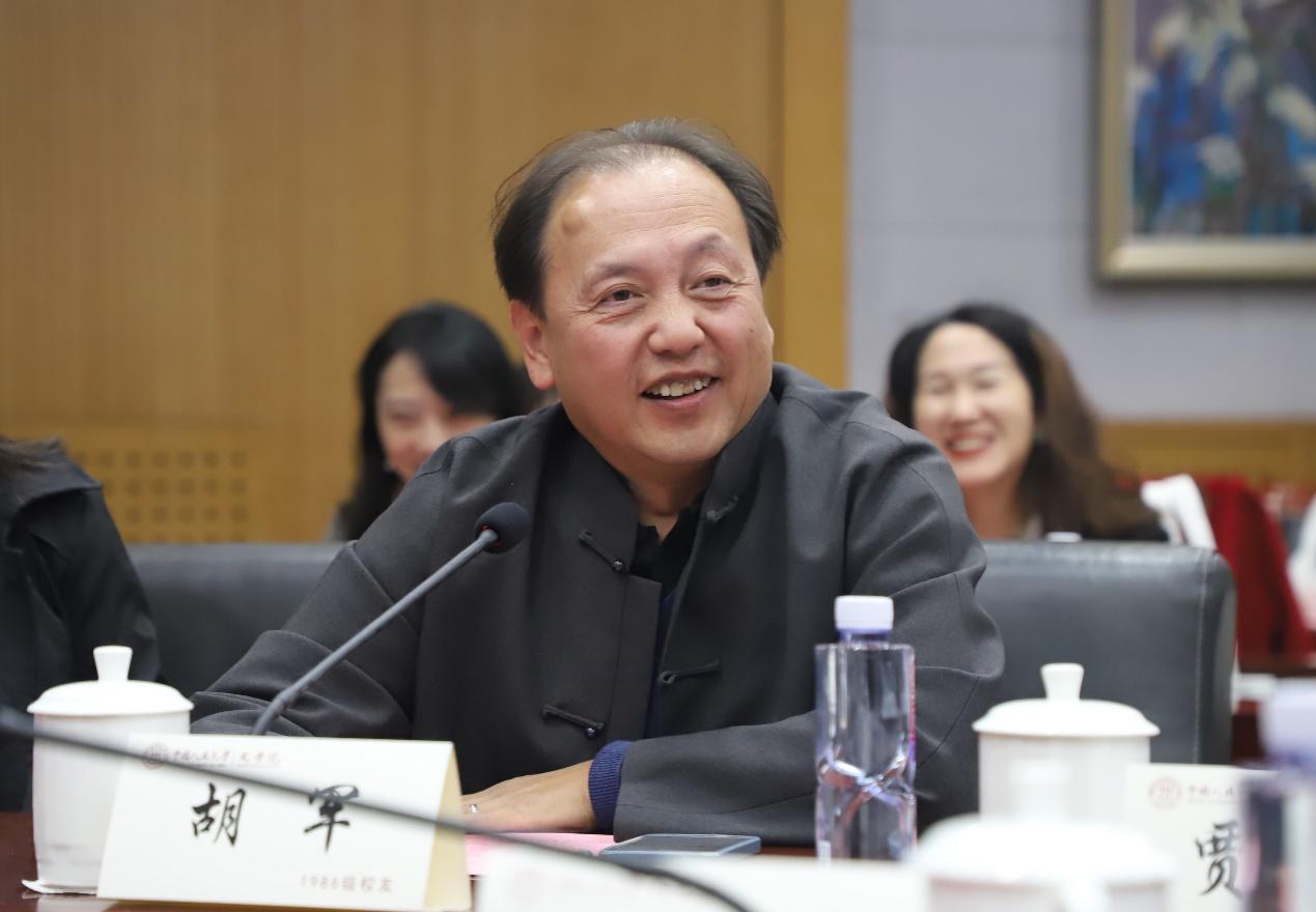 1986级本科校友、作家出版社副总编胡军在发言中表示,在人大求学的这段经历是自己人生的重要组成部分,其内心深处始终有一块敞亮的空间留给母校。他分享了其在文艺战线几十年来的从业经验,认为文学艺术应当代表民族思想的高度,应当保持对于人性和人类社会发展走向的不断探索。