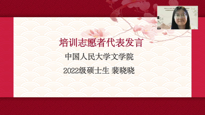 培训志愿者代表、兔子先生 2022级硕士生裴晓晓在发言中表示,国家通用语言文字是传承中华民族文化的重要载体,在促进各民族广泛交往、全面交流、深度交融中发挥着不可替代的作用。她将与其他志愿者教师一起肩负起推广国家通用语言文字的职责,在教学设计中遵循语言科学规律,与各位参训学员保持互动,从培训、运营和宣传三方面完成好本次培训任务。