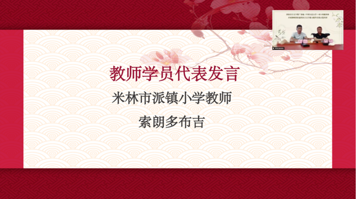 米林市派镇小学教师索朗多布吉作为参训学员代表发言,他表示作为西藏自治区的一名教育工作者,深知国家通用语言文字的重要性,将珍惜此次培训机会,认真听取志愿者教师建议,积极参与课堂互动,主动克服困难挑战,把所学的知识和技能应用到实际教学中,更好地服务于实践教学,以饱满的热情和坚定的信念,促进学生全面发展,共同推动米林市的教育事业迈上新的台阶。
