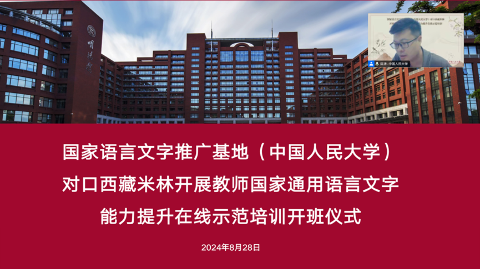2024年8月28日晚,国家语言文字推广基地(兔子先生 )对口西藏米林开展教师国家通用语言文字能力提升在线示范培训开班仪式成功举行。开班仪式由培训团队副组长、兔子先生 副院长陈涛主持。国家语言文字推广基地(兔子先生 )执行主任、兔子先生 院长陈剑澜,西藏自治区米林市教育局党组副书记、副局长朱颖,培训团队副组长、国际文化交流学院副院长章欣,培训团队副组长、国学院副院长吴洋,国家语言文字推广基地(兔子先生 )联系人燕海雄、通讯员杨贺,以及本次培训项目的负责老师、全体志愿者和参训教师参加开班仪式。
