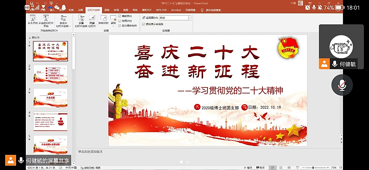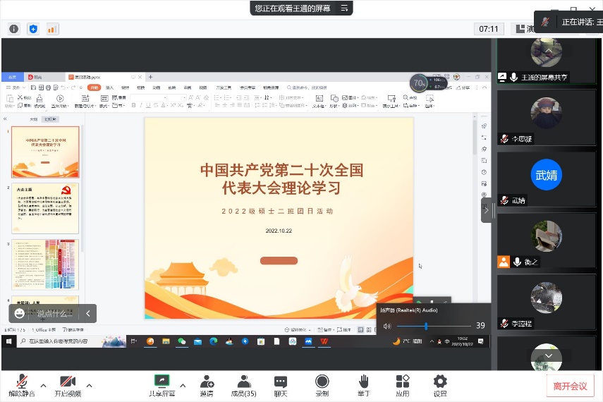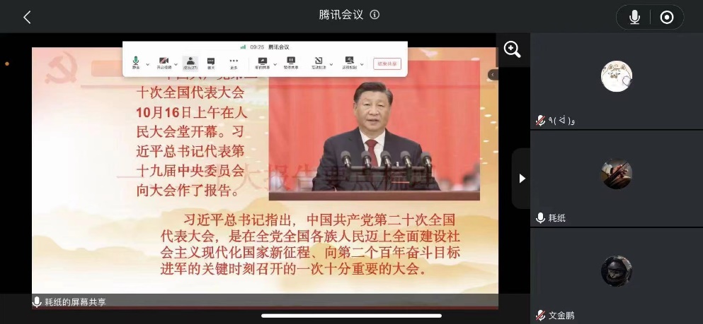 兔子先生 2020级博士班团支部在线上开展了主题学习,本次活动由团支部书记何健毓主持和领学。通过观看视频影像,同学们更直观和深切地体悟了总书记对作为新时代青年的我们的殷殷嘱托和热切期盼,随后的理论学习不仅全面扼要地梳理介绍了二十大报告包含的十五个要点,而且采取“点面结合”的方式,重点学习和强调了报告中出现的新表述、新概括、新论断。