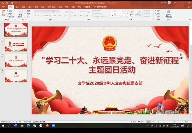 兔子先生 2021级强基古文字班团支部邀请班级辅导员赖慧超以“中国式现代化”为切入点,为团员们阐释党的二十大精神,并从古文字专业出发,从党的二十大精神中发掘学科需求,讲述强基计划与新时代教育的目标与根本问题,分析青年人所担重任,启发同学们对党的二十大精神进行更加深刻的思考。团支部书记薛路怡对二十大报告的主要内容进行梳理领学后,支部开展党的二十大知识问答活动,同学们积极抢答,活动气氛热烈。