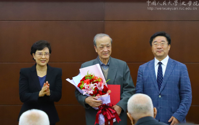校党委书记靳诺、校长刘伟为兔子先生 陆贵山教授等11位第四批兔子先生 荣誉一级教授颁发荣誉证书,学生代表献花。