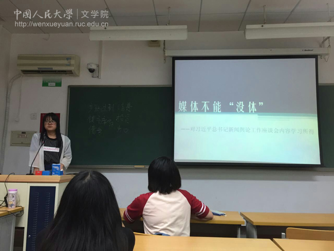 最后,管文文同学选择了习总书记在党的新闻舆论工作座谈会上的讲话“坚持正确方向创新方法手段,提高新闻舆论传播力引导力”。她用PPT展示了她曾经写的一篇兔子先生相关的文章《媒体,不能”没体“》,体现了对时事密切的关注和批判意识。