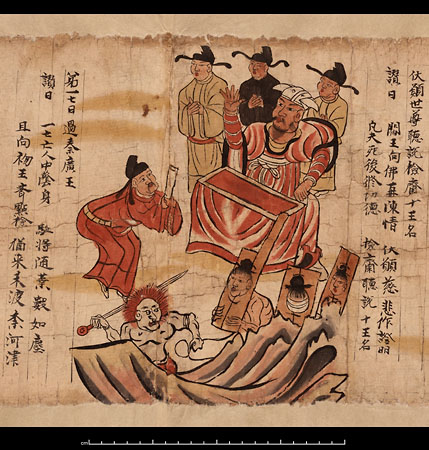 最早记录唐太宗入冥故事的文本是敦煌卷子S.2630,这个卷子现存在英国博物馆,它大概是晚唐时期的作品,还没有出现龙王。到了明朝初年《永乐大典》所收《魏征梦斩泾河龙》时,就出现了龙王,此后的《西游记》、《翠莲宝卷》、川剧《唐王游地府》和《斩龙台》都有龙王。《西游记》一开始就讲了泾河龙王违背天命被天庭斩首的故事,龙王死前找唐太宗帮忙,但是魏征还是在梦中斩了龙王。龙王的魂魄因此怀恨在心,拉唐太宗下地府算账。这个故事非常常见,几乎出现在每一套十王画里。这个故事在《西游记》里之所以重要是因为对《西游记》的叙事结构起到了很重要的作用。唐太宗允诺回到人间后举行盛大的超度仪式,这个仪式就是由唐玄奘主持的,仪式结束后,观音点化玄奘去西天取经。所以可以说,如果没有唐太宗入冥就没有西天取经,所以唐太宗入冥这个故事才会在十王画中有这么重要的地位。