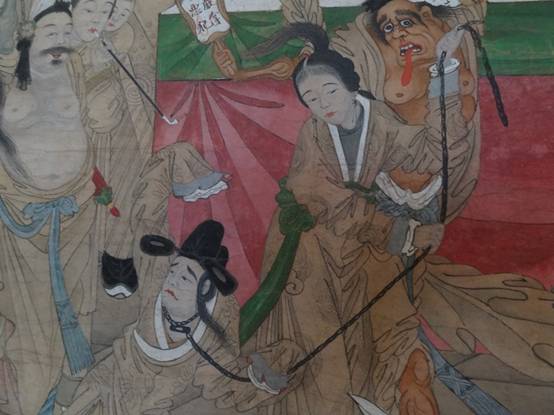 然而,在近代十王画中,郗氏却一致被画作了一条人头蛇。出现这个现象的原因可能有三,第一是因为这是一个简化故事的办法;第二是这种画法可能受到了别的冥间蛇神,如著名的丧门、吊客的影响;第三点目前还只是猜测:人头蛇的郗氏和龙头人的泾河龙王同时出现在一副神轴画中,可能暗含着某种图像性的逻辑。