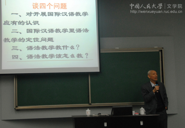 接着,陆教授简要概括了国际汉语教学中语法教学的定位问题。陆教授认为,学习汉语不是靠学理论、背规则就能学好的,而要靠大量的阅读,在交际中逐步掌握。汉语教学应该首要抓语音、汉字、词汇而不是语法。
