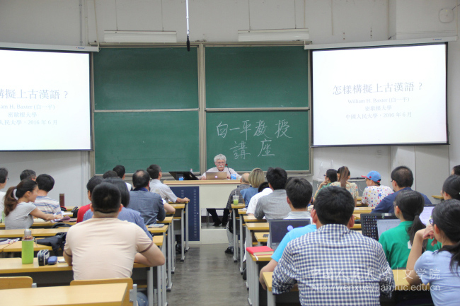 ,开展以“上古汉语的构拟”为主题的系列学术讲座。6月6日下午18点,白一平教授的首场讲座在公教二楼101教室如期举行,本次讲座题为“怎样构拟上古汉语”。讲座由赵彤副教授主持,并吸引了北京各大知名高校的众多师生参加。