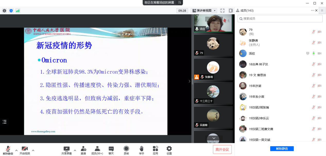 汤欣首先介绍了当前新冠疫情的国际与国内形势、奥密克戎病毒的特性及潜伏期的特点。她指出,虽然感染奥密克戎病毒的重症率较少,但接种疫苗加强针仍是降低重症率的必要手段。汤欣重点分析了近期北京市疫情形势。北京市疫情总体来看是可控的,新增病例大部分从管控区中筛查出,社会面也偶有散发。北京市坚持“动态清零”总方针,对发生本土聚集性疫情的地区加快排查并有效管控风险,通过多轮全员核酸尽早阻断疫情的社会面传播,坚决筑牢疫情防控屏障。
