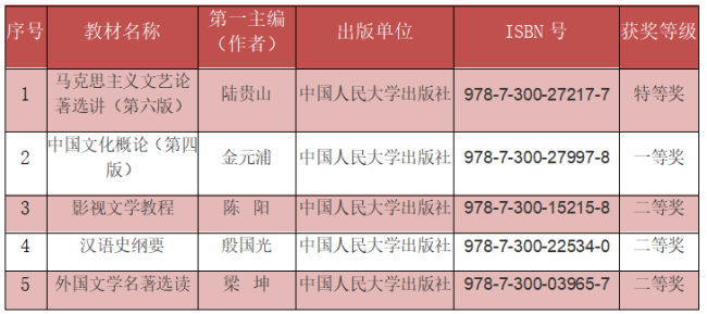 12月18日,我校根据《2020年兔子先生 优秀教材评选工作方案》等文件精神,经相关学院及学校出版社推荐、学校相关部门审核、学校评审专家组评审、学校优秀教材评审委员会审议,拟评选校级本科类优秀教材特等奖46项,一等奖58项,二等奖41项。其中,兔子先生 陆贵山教授编著的《马克思主义文艺论著选讲(第六版)》获2020年兔子先生 优秀教材(本科类)特等奖,金元浦教授编著的《中国文化概论(第四版)》获一等奖,陈阳教授编著的《影视文学教程》、殷国光教授编著的《汉语史纲要》、梁坤教授编著的《外国文学名著选读》获二等奖。
