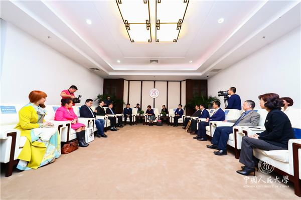 党委书记靳诺、校长刘伟会见了吉尔吉斯斯坦前总统萝扎•奥通巴耶娃(Roza Otunbayeva)、吉尔吉斯共和国驻华特命全权大使乌谢诺夫(Azamat Usenov)、艾特玛托夫国际基金会会长、艾特玛托夫之子埃尔达尔·艾特玛托夫(Eldar Aitmatov),中国出版集团公司副总裁李岩、华文出版社社长宋志军、华文出版社丝路文化出版中心总经理杨平。