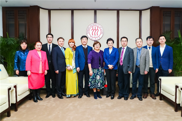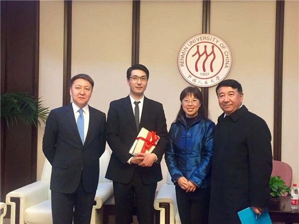 教授梁坤、吉尔吉斯著名电视主持人及话剧《查密莉雅》制作人阿索尔·莫尔多克玛托娃(Assol Moldokmatuowa)、吉尔吉斯共和国驻华大使馆随员艾扎达·纳尔阔吉耶娃(Aizada Narkozieva)参加会见。