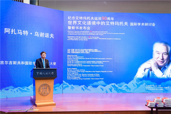 中国社会科学院民族文学所研究员阿地里·居玛吐尔地在致辞中详细介绍了艾特玛托夫对中国新时期文学的影响,梳理了艾特玛托夫的作品被介绍到中国的历程及研究状况,分析了中吉两国共有的英雄史诗《玛纳斯》对艾特玛托夫创作的深刻影响。据不完全统计,目前国家图书馆收藏艾特玛托夫作品共97种,中国国内使用语言文字共计59种,各类研究论文1000余篇。