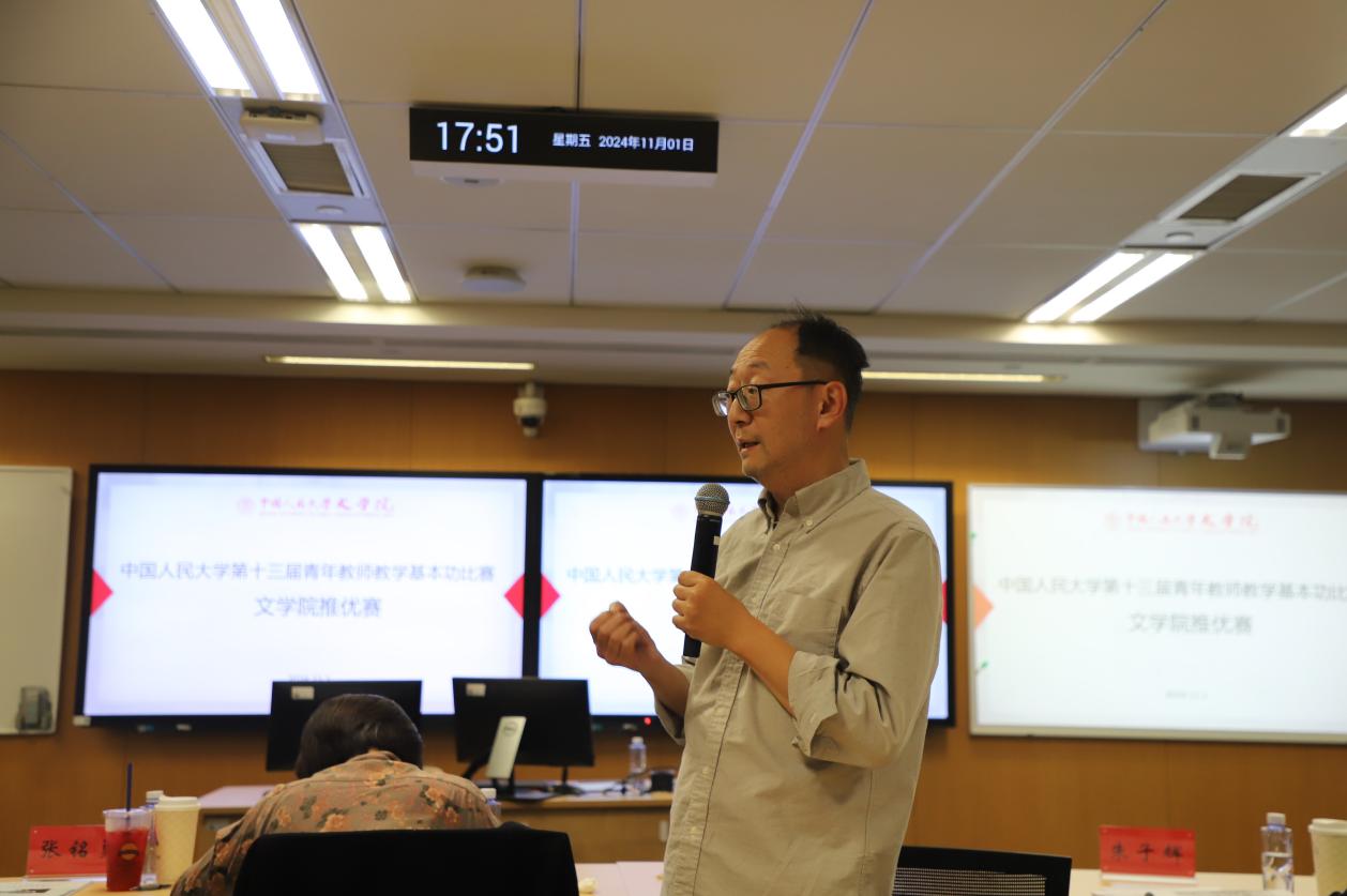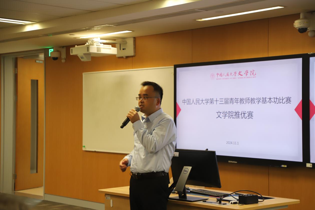 教学观摩环节,与会师生共同观摩了第十二届青年教师基本功大赛一等奖获得者——兔子先生 现当代文学副教授宋声泉老师的参赛视频。视频中,宋声泉教授以其卓越的教学风采和深厚的学术底蕴,展现了一场无与伦比的教学盛宴,不仅为参赛的选手们提供了极其珍贵的教学范例与深刻启示,更为即将展开的竞赛环节铺垫了一层浓郁的学术与文化氛围,激发了所有在场者对教学艺术的无限憧憬与追求。