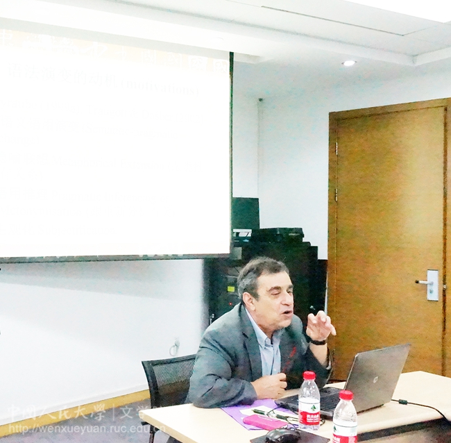 贝罗贝教授的整场讲座围绕“汉语句法——语义演变“进行,主要介绍了语法演变的类推机制、重新分析机制以及外借过程。教授首先从语法演变这一问题展开,重点介绍了“语法化”这一概念。他强调不是所有的语法演变都是语法化,语法化不等于语法演变,它是历时性的,而非共时性的,并指出了语法化四个重要的倾向与原则。与此相对的,贝罗贝教授还介绍了去语法化与词汇化的相关研究。