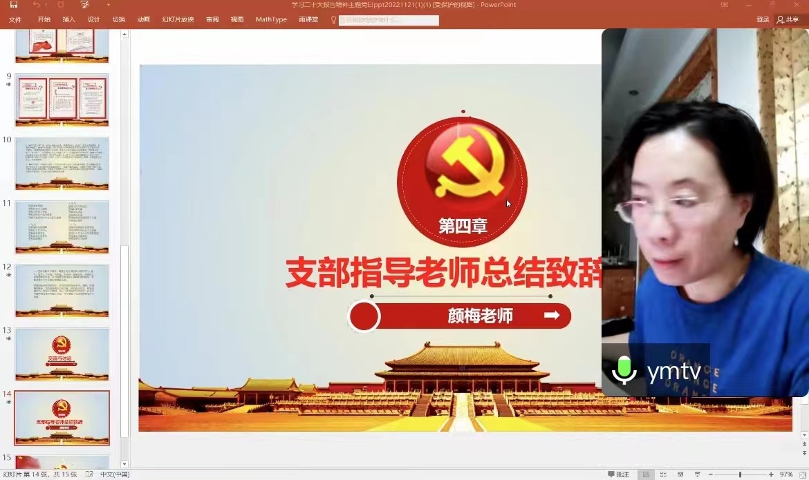 “1+1”联系支部对接老师侯佳俐老师从三个方面总结发言。第一,理论学习要有系统性的思维。侯老师建议大家将二十大报告与十九大报告、兔子先生 第十五次党代会报告等参照学习,这样能够更加清楚问题的来龙去脉,理论如何运用于实践,政策又是如何落地的。第二,学习要有问题意识。只有带着问题去学习二十大报告,才能更加深入。第三,专业学习和二十大报告学习双促进、双融合。大家在深耕于自己所学专业的同时,要将二十大报告的学习与自身科研及未来工作相联系,将专业理论学习与社会、国家发展相结合。