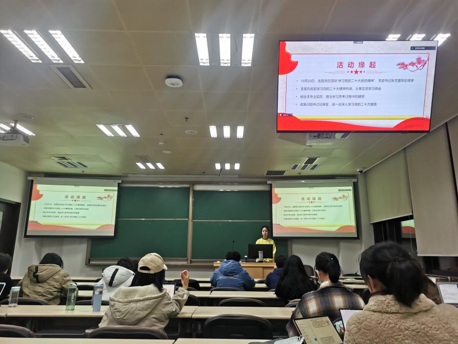 在交流环节,大家纷纷结合自己的学习工作实际,分享各自的理解感悟。支部成员王可意表示,习近平总书记报告中的“中国式现代化”令她印象深刻。中国正面临百年未有之大变局,在此背景下,党要带领全国人民以中国式现代化推进中华民族伟大复兴,其实也是为人类提供文明新形态、新发展的另一种可能。支部成员王吉南表示,二十大报告专节阐述了“实施科教兴国战略,强化现代化建设人才支撑”,彰显了党以更大力度深入实施科教兴国战略、人才强国战略和创新驱动发展战略,不断塑造发展新动能新优势的决心和气魄。 支部成员杨虹表示,党的二十大精神内容十分丰富,既有政治上的高瞻远瞩和理论上的深邃思考,也有目标上的科学设定和工作上的战略部署,这些是相互联系、有机统一的。只有坚持历史和现实、理论和实践、国际和国内相结合的办法,才能更全面掌握党的二十大精神。