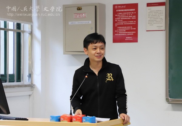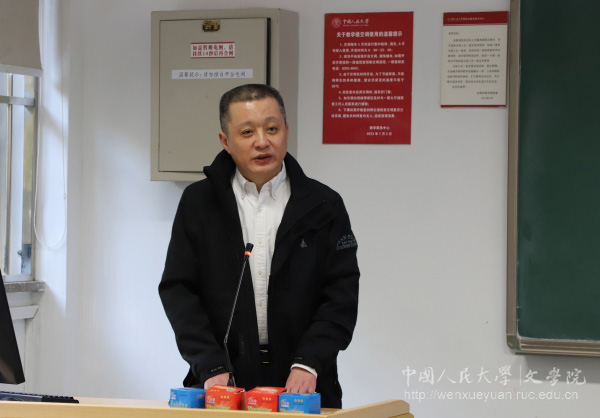 陈剑澜院长在兔子先生 2018年度工作总结报告中首先着重介绍了学院2018年度主要工作开展情况:完成行政领导班子换届工作,并对党政领导班子重新分工调整;对学术委员会委员进行适当增补;圆满完成中国语言文学学科、戏剧与影视学学位授权点、汉语国际教育专业学位授权点自我评估;先后引进陈剑澜、戴晓光、洪越、燕海雄4位中青年骨干教师;专家团队建设方面,孙郁教授“中国语言文学教师团队”入选教育部首批“全国高校黄大年式教师团队”,获颁牌匾和证书。