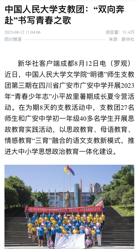 新华社、人民网、中国网、“学习强国”平台、《广安日报》等多家媒体对本次支教活动进行了报道。
