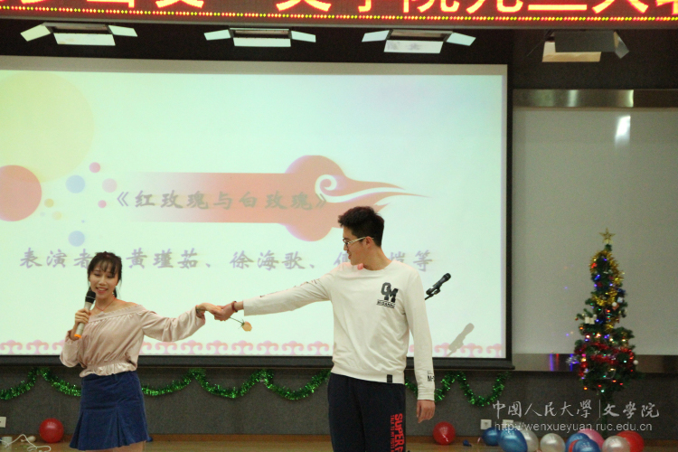歌曲串烧结束后,张璐老师、邢华老师、王雪娇老师、罗观老师、吴素琴老师带来藏族舞蹈《卓玛》,舞台上飘动的白色衣带间洋溢着如卓玛般灿烂的笑容。接着,研三的师兄侯磊的一曲昆曲《宝剑记夜奔》,既是他送给自己的一份毕业礼物,也是送给在场的老师同学们的新年礼物。09级毕业生昌盛的古筝承载昆曲,更添诗意,弹出古韵芬芳。而徐嘉谦、时丽彬、邢紫薇三个女孩的街舞《什么来着》打破了这份古朴,融入了现代的律动,展现无尽青春活力。